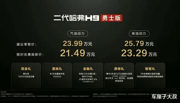 近日,哈弗推出了二代H9的勇士版车型,官方指导价23.99万元起(柴油版指导价为25.79万元)千红网,同时公布了限时换新价21.49万元起。