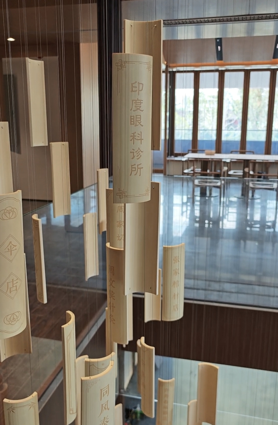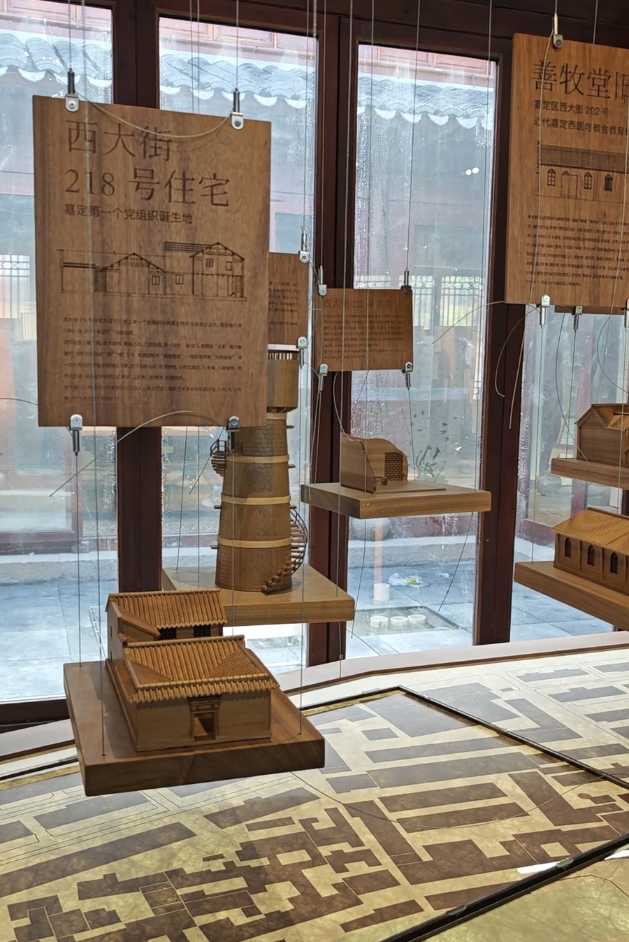 再往里走,还能看到一幅数字长卷和一张长桌。其中,长桌的展陈尤其特别,通过⽴体吊挂的⽅式,将建筑绘本⼿册、古建模型以及建筑修缮资料进行呈现,带领人们走近西大街的9栋文保建筑和5个古迹。同样的立体吊挂手法也出现在中庭。设计团队挖掘史料,将曾经老街上的诊所、火油店、伞店、南货店、面粉厂等百业百态,通过国家级非遗嘉定竹刻呈现,吊挂成立体装置,展现街区昔日商业的繁华。