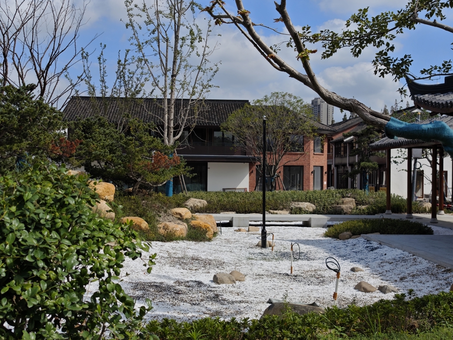 作为整个历史文化街区的自然放松共享空间,公园结合“烟火西门,雅意画境”定位,以文化为魂,传承嘉定文脉,从北至南设纳福海、梵静庭、蕉乐院、盆景园、友云亭、观华苑、寻香径、访禅溪“八景”,随景观空间层次,体现“园包寺”精神文化的递进关系,呼应先行启动区“佛禅栖心”功能区整体基调。